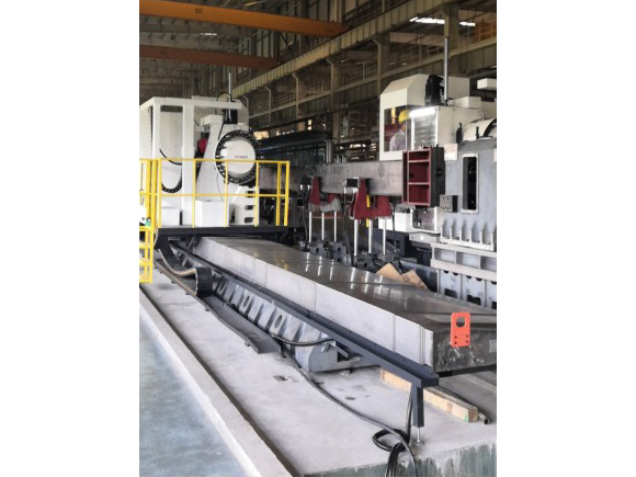重型卡車和礦用卡車的承載車廂的承載梁,傳統(tǒng)采用分體加工、再依靠工裝進(jìn)行焊接和車廂總裝,存在變形大和上自動(dòng)組裝線困難的問(wèn)題;本產(chǎn)品為焊接車梁整體加工的全數(shù)控的雙面臥式加工中心,融合大型零件(12米長(zhǎng))雙面自動(dòng)化數(shù)控加工技術(shù)、工件自動(dòng)數(shù)控回轉(zhuǎn)翻身工藝,將環(huán)保準(zhǔn)干式切削等加工理念植入機(jī)床的結(jié)構(gòu)設(shè)計(jì),既解決了分體加工后組焊的變形問(wèn)題,又為車架的自動(dòng)化產(chǎn)線提供基準(zhǔn),達(dá)到減員增效和提高自動(dòng)化的目的。